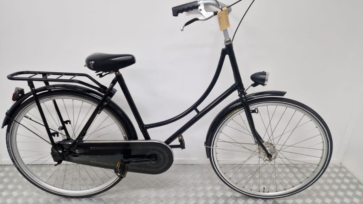 Klassieke omafiets in tijdloos zwart, ideaal voor dagelijks gebruik. Deze robuuste stadsfiets is voorzien van een comfortabele zithouding, een onderhoudsarme gesloten kettingkast en een betrouwbare terugtraprem. Dankzij het sterke stalen frame en het eenvoudige ontwerp is dit de perfecte fiets voor wie gewoon zorgeloos wil fietsen.